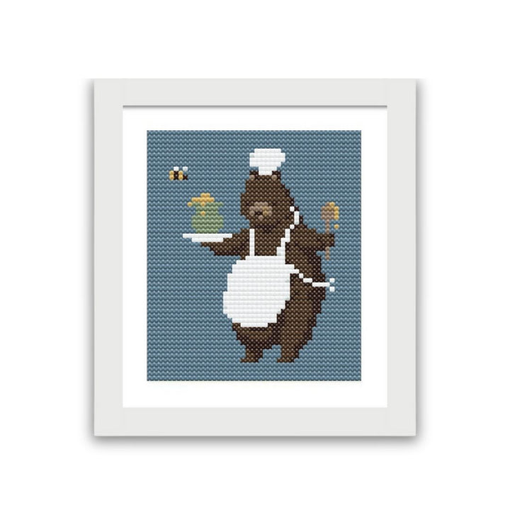 Bring a touch of sweetness into your home with this adorable cross-stitched framed artwork featuring a bear enjoying a pot of honey. This artwork is perfect for creating a warm and inviting atmosphere, making it a great addition to a kitchen, nursery, or any space that could use a dose of comfort and charm.