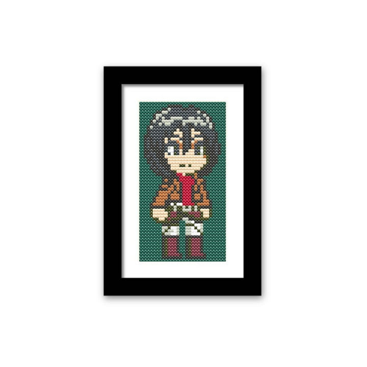 Honor the strength and determination of Mikasa Ackerman with this powerful cross-stitched artwork. Featuring her iconic scarf and stoic expression, this piece captures the resilience and quiet power of one of Attack on Titan’s most beloved characters.