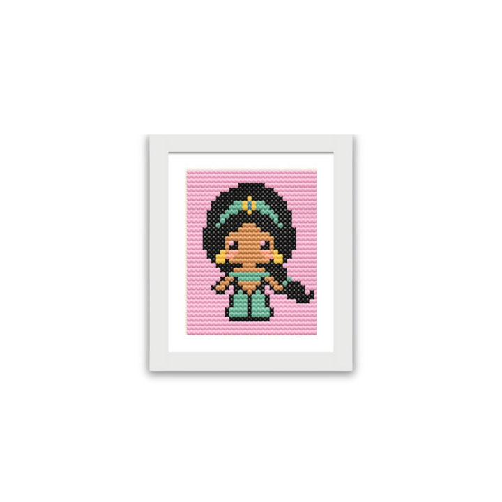 This elegant cross-stitched portrait of Princess Jasmine captures her grace and adventurous spirit. With her vibrant attire and royal beauty, this piece brings a magical touch to your decor