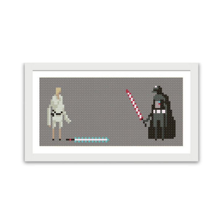 Relive the legendary duel between good and evil with this striking cross-stitched artwork featuring Skywalker and Darth Vader. The piece captures the dramatic tension of the iconic lightsaber battle, with bold silhouettes and dynamic contrast. A must-have for any Star Wars enthusiast, it adds cinematic power and galactic flair to your space.